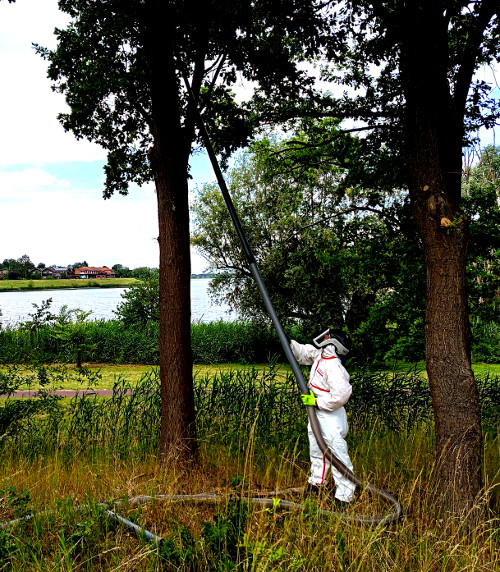 Neben der Pflege von Bäumen und Wiesen biete ich auch kompetente Hilfe bei der Beseitigung des Eichenprozessionsspinners an. Dabei kommt ausschließlich die Methode des Absaugens der Nester zum Einsatz – sie ist die einzige wirklich effektive Technik, um sowohl das Insekt selbst als auch die gefährlichen Brennhaare vollständig und sicher zu entfernen. Ob hoch oben im Kronenbereich oder an schwer zugänglichen Bäumen – ich sauge zuverlässig und fachgerecht ab und entsorge professionell und umweltgerecht.